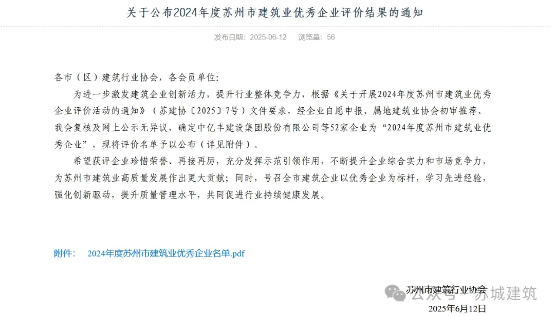 6月12日,蘇州市建筑行業(yè)協(xié)會(huì)正式公布2024年度蘇州市建筑業(yè)優(yōu)秀企業(yè)名單,蘇城建筑憑借卓越的綜合實(shí)力、優(yōu)質(zhì)的工程質(zhì)量和良好的行業(yè)口碑,再次榮耀登榜,連續(xù)多年獲評(píng)“優(yōu)秀企業(yè)”稱號(hào),彰顯了企業(yè)在蘇州建筑行業(yè)的領(lǐng)先地位和品牌影響力。